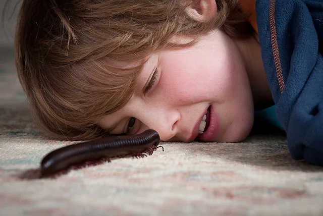 But the star of the show, and Tim’s pride and joy is Myer the Giant African Train Millipede (Archispirostreptus gigas). Myer is about 10 inches long and a delightful, gentle arthropod. There are several subspecies of millipedes, but this is one of the most popular for keeping as a pet. Myer is a vegetarian or herbivore. Even though the name means ‘1000 legs,’ no species of millipede actually has that many. Depending on the species, they have several hundred at most. Millipedes have 4 legs (2 sets) per each segment in their bodies. From time to time, a millipede moults. Moulting is a way of growing. When the millipede grows, it gains more body segments and, with them, more new legs. On average, this species has a life span of between seven and ten years. This puts Myer, at six years old, around what humans might call middle aged.